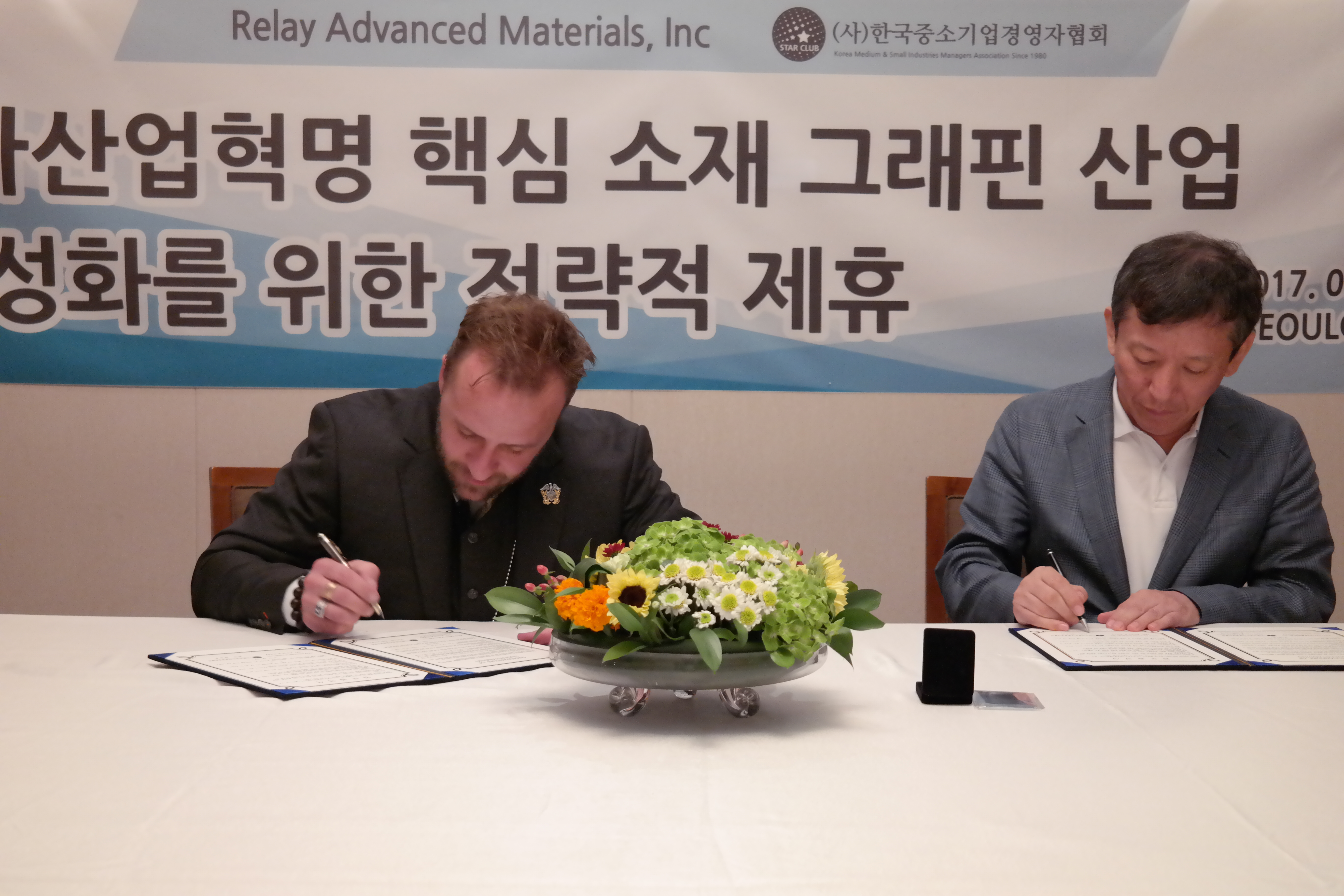 Relay사 Arron CEO는 “그래핀은 에너지와 환경문제 해결에 도움을 주고 산업을 혁신할 무한한 잠재력을 지닌 첨단 소재다. 독점적 이윤 추구가 아니라 수많은 중소기업 들과 함께 우리 삶의 문제를 해결하는데 기여하고 어려움에 처한 저개발국에 도움을 줄 수 있도록 하자“고 말하고 ”한국중소기업경영자협회는 이러한 우리의 비전을 실천하는데 함께할 좋은 파트너라고 생각한다“고 강조했다.